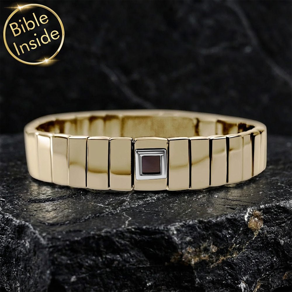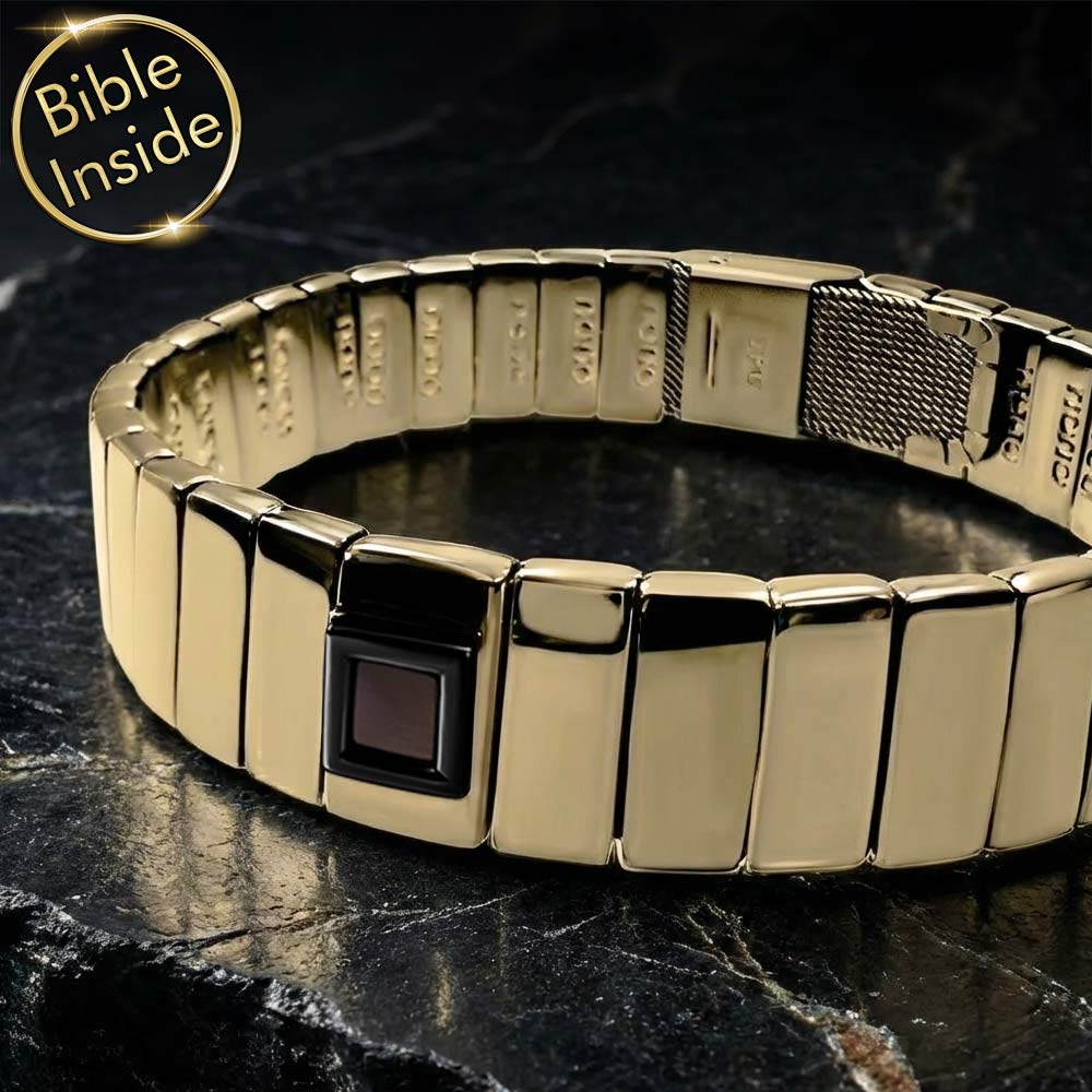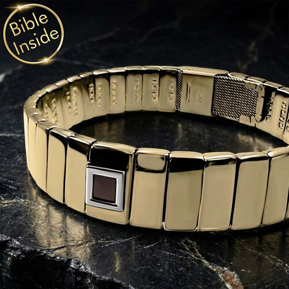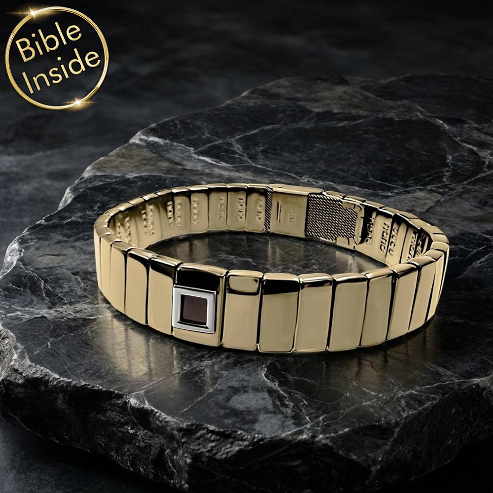 צמיד הננו תנ"ך שלנו מיוצר בקפידה מפלדת אל חלד באיכות הגבוהה ביותר, עם ציפוי זהב מרשים. גימור מבריק ביותר מעניק לו מראה יוקרתי. התכשיט עמיד במים, כך שניתן ללבוש אותו בכל עת ללא דאגה, בין אם זה במקלחת או בשחייה.
