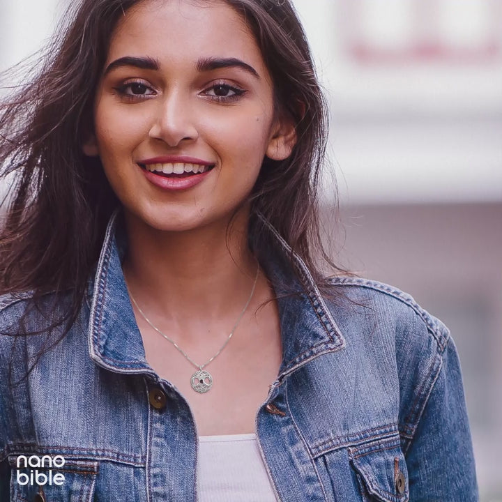 שרשרת זהב זו לאישה מציגה את המפגש המושלם בין יופי עכשווי לחכמה עתיקה. תליון עץ החיים העגול מרוצף בזירקוניות נוצצות ומשבץ בחלקו הפנימי את שבב הננו תנ"ך הייחודי שלנו. כשהיא תענוד שרשרת זהב זו, היא תישא עמה את כל ספרי התנ"ך כולל ספר תהילים, החרוטים בטכנולוגיה מתקדמת על שבב קטנטן בגודל 0.5 ס"מ.