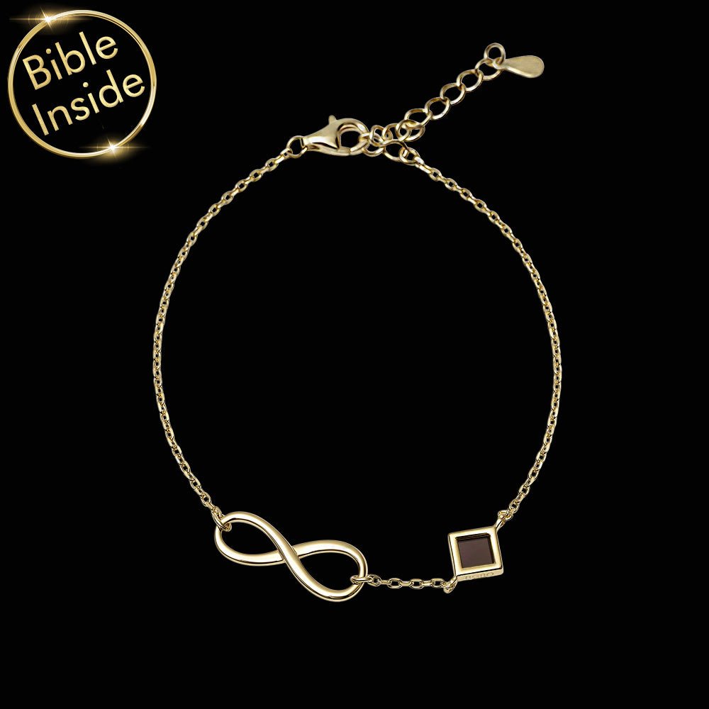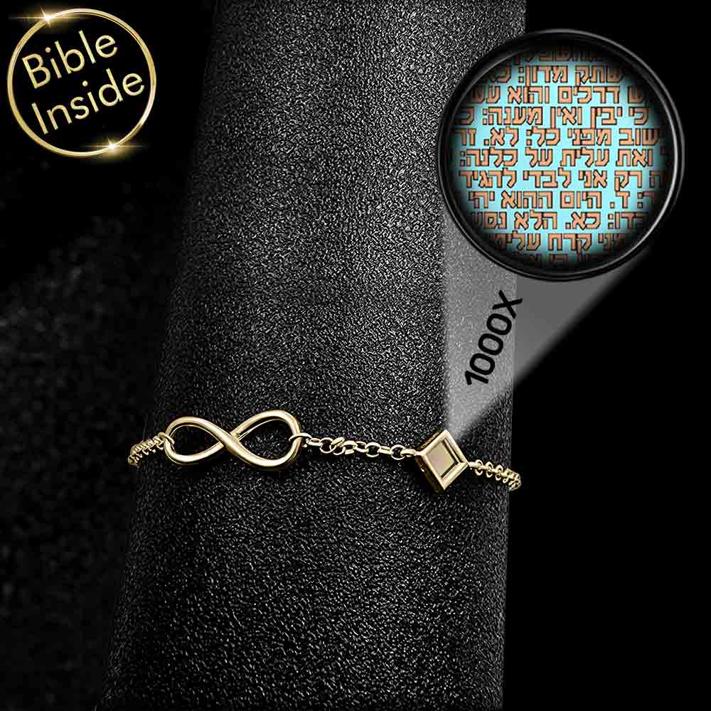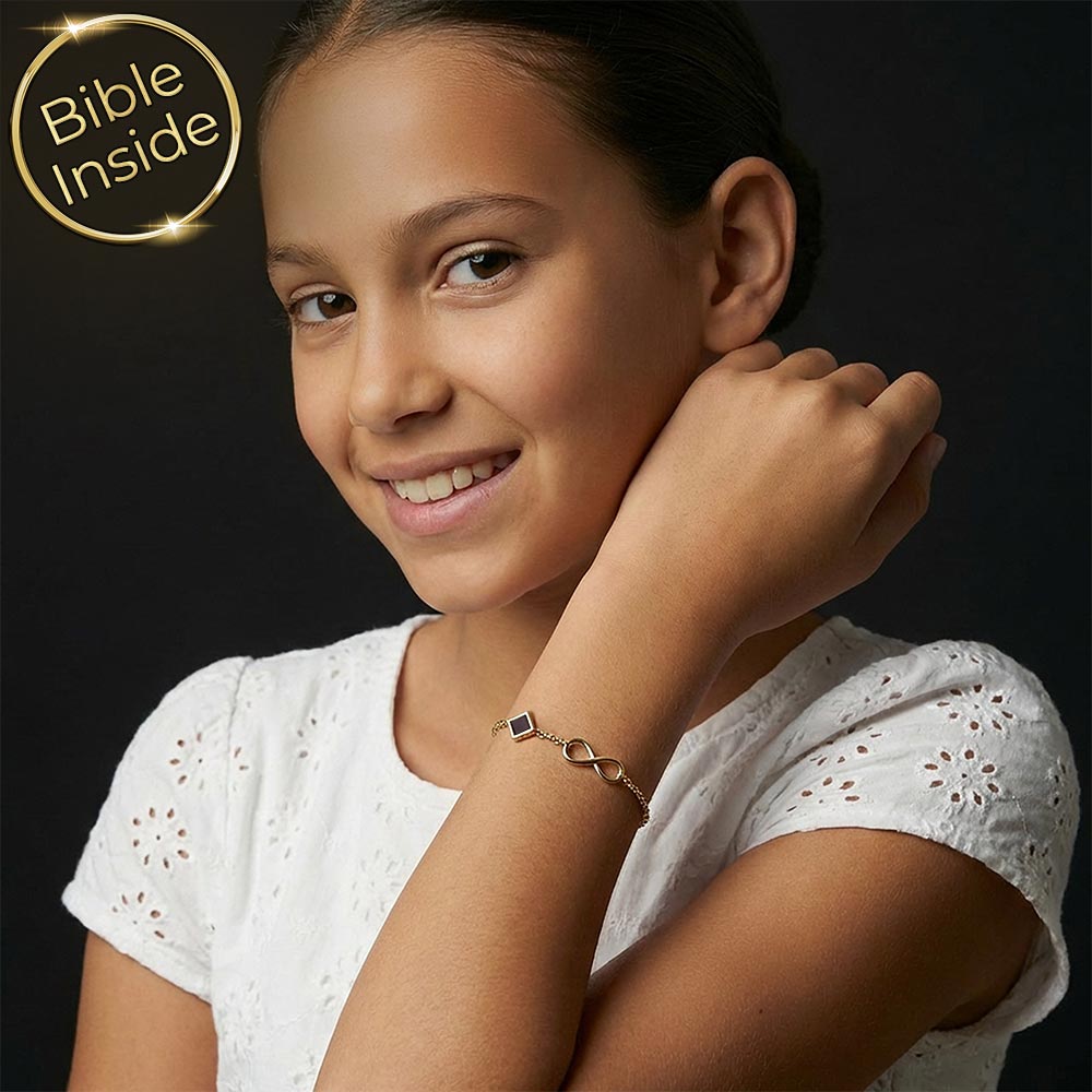 צמיד לבת מצווה בעיצוב אינסוף נצחי שמכיל את התנ"ך כולו. תכשיט עדין ומינימליסטי שמסמל אהבה אינסופית ומחבר את הנערה למורשת היהודית ברגע הגדול שלה.