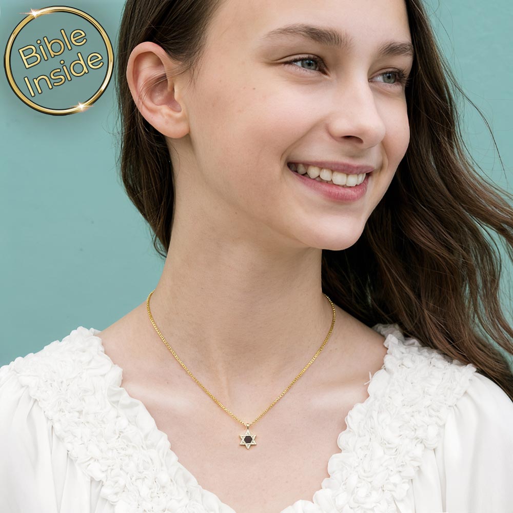השרשרת משלבת עיצוב מגן דוד נוצץ עם זירקונים ושבב ננו תנ"ך שמכיל את כל 24 ספרי התנ"ך. זה תכשיט זהב בעל משמעות עמוקה שמחבר את המתבגרת לשורשים היהודיים.