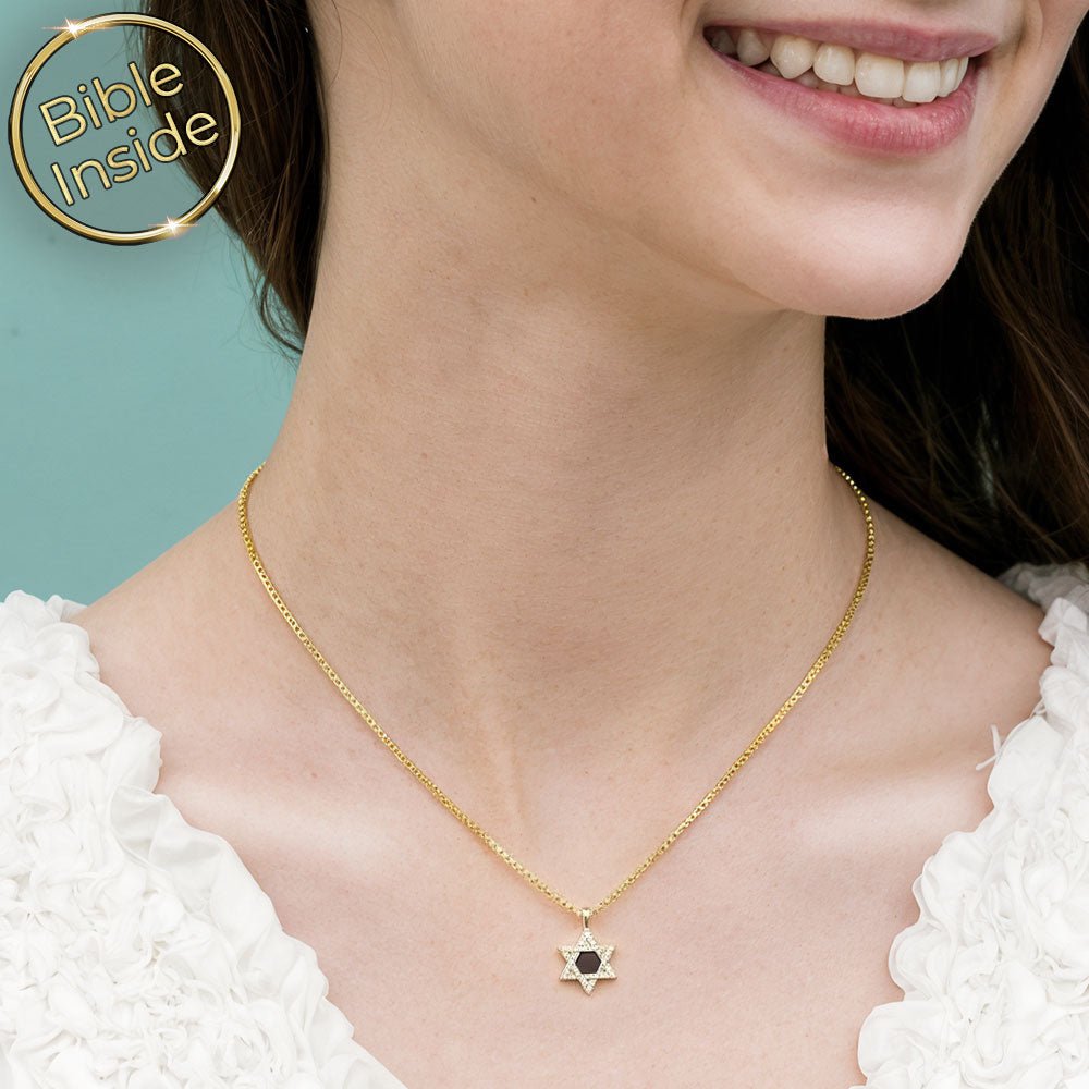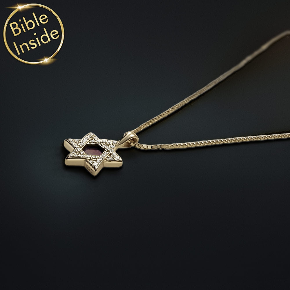 שרשרת זהב 14K לבת מצווה שמשלבת עיצוב מגן דוד נוצץ עם כל התנ"ך. תליון אלגנטי עם זירקונים נוצצים ושבב זעיר במרכזו שמכיל את כל ספרי הקודש מבראשית ועד דברי הימים. תכשיט יהודי בעל משמעות עמוקה לרגע הגדול בחייה.