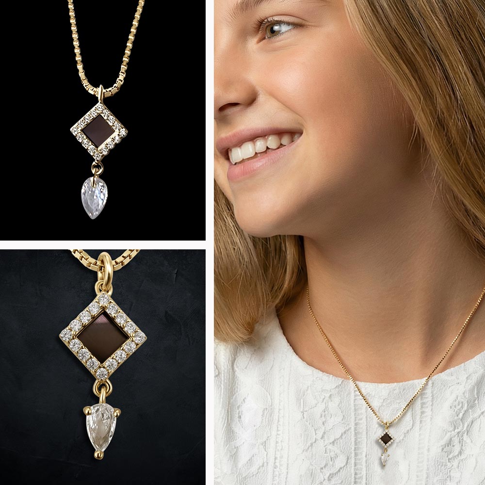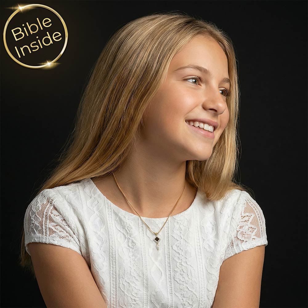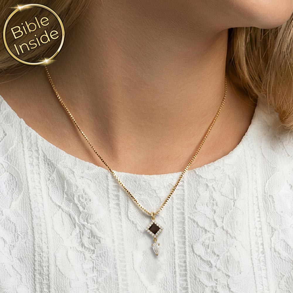 מה מיוחד בשרשרת זהב לבת מצווה הזו? השרשרת משלבת עיצוב עדין ונוצץ עם תליון מעוין וזירקון טיפה, ובתוכה ננו תנ"ך שלם עם כל ספרי התנ"ך. זה תכשיט זהב שהוא גם יפה וגם בעל משמעות שילך איתה לאורך שנים ארוכות.