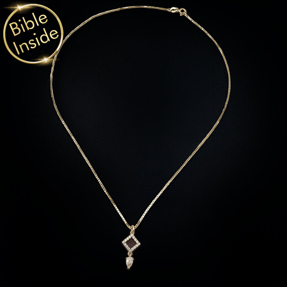 שרשרת זהב לבת מצווה שמשלבת עיצוב עדין ומודרני עם ננו תנ"ך שלם. תליון מעוין מעוטר בזירקונים וטיפה שמתנדנדת בעדינות. תכשיט זהב 14 קראט בעל משמעות עמוקה שמכיל את כל ספרי התנ"ך מבראשית ועד דברי הימים.