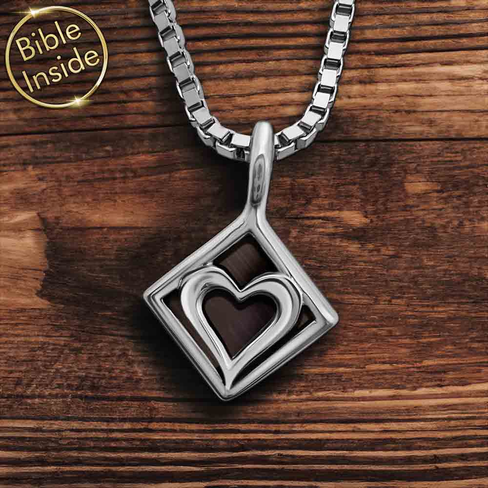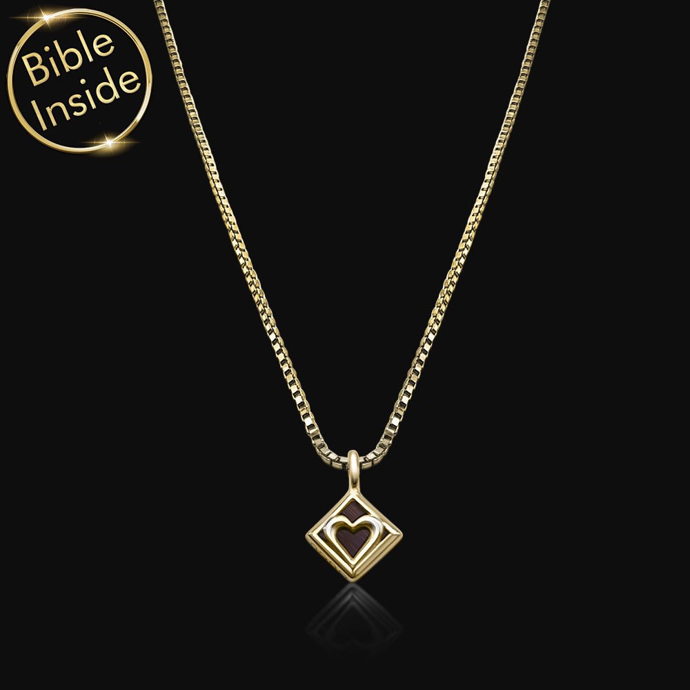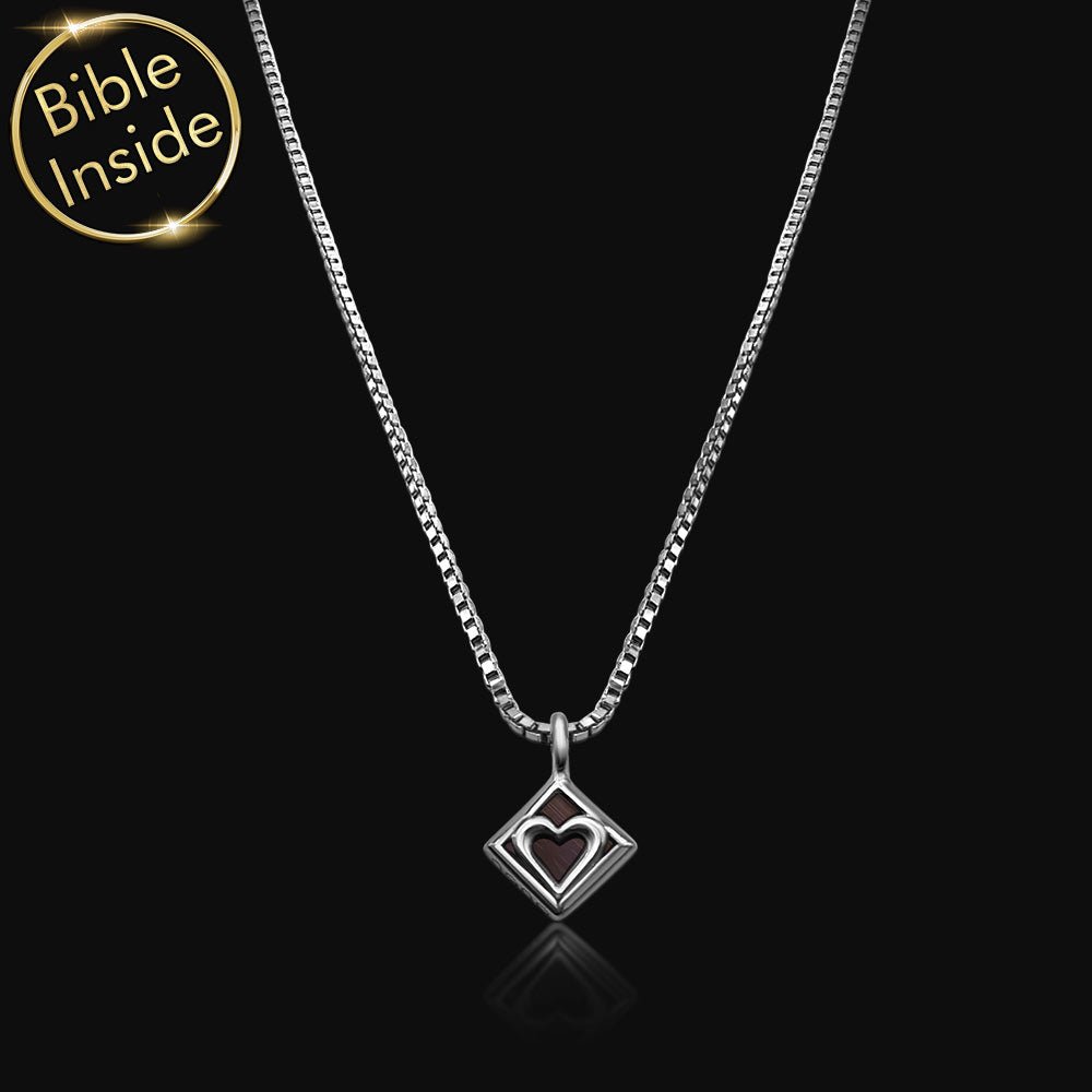 שרשרת שמשלבת תליון מעוין עדין עם לב בפנים וננו תנך. התכשיט מכיל את כל 24 ספרי התנך החרוטים על שבב קטן של 0.5 ס"מ. עיצוב מינימליסטי שמביא חיבור לשורשים ולמורשת.