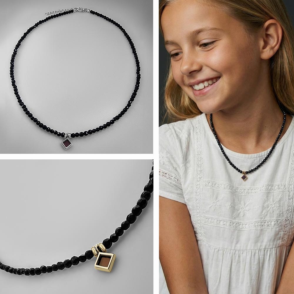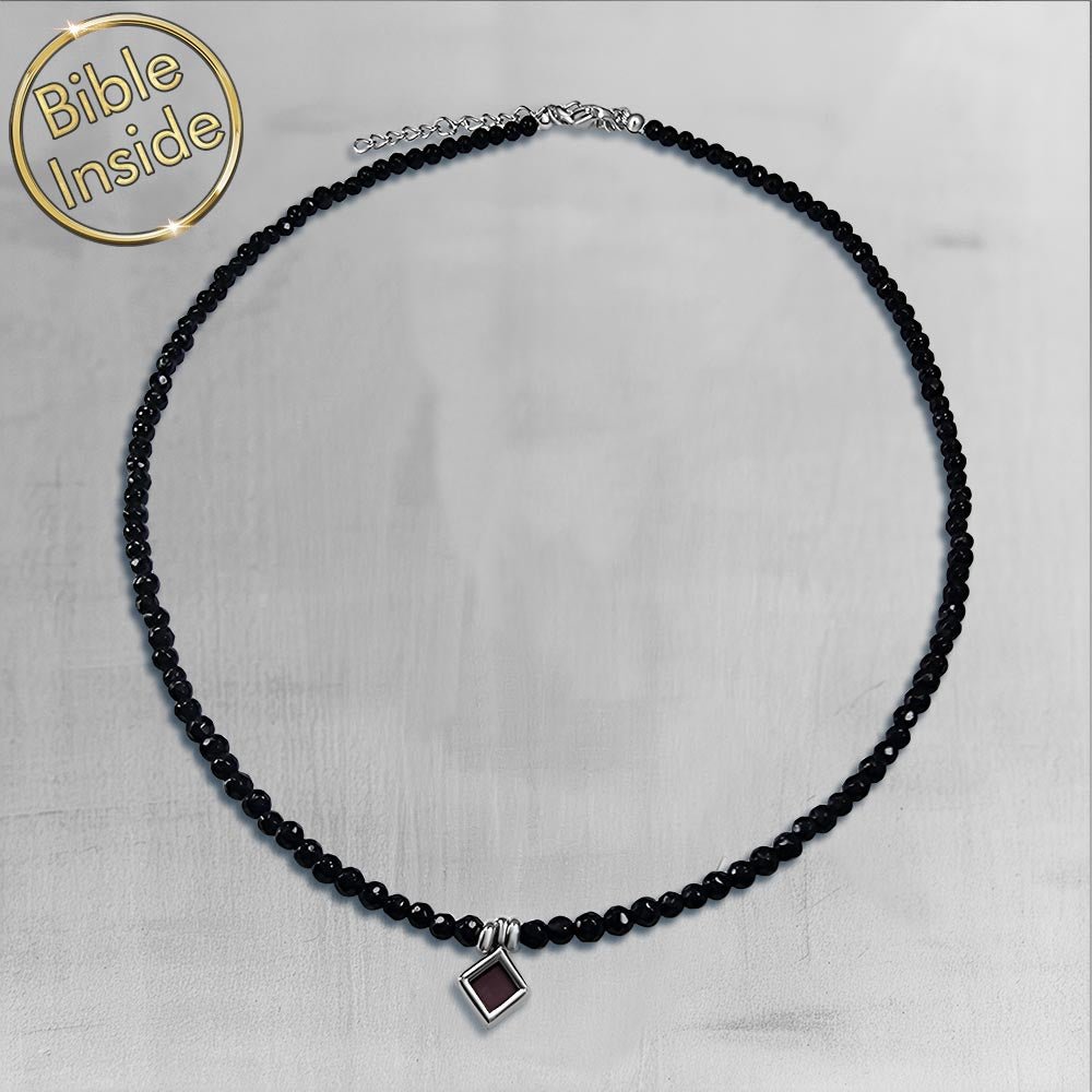 תכשיט מיוחד לילדת בת מצווה שלא רוצה להיראות כמו כולן. השרשרת הזו עשויה מחרוזי אוניקס טבעיים שחורים שנותנים לוק קלאסי ואורבני. היא יושבת על הצוואר כמו צ'וקר מינימליסטי, ובמרכז תלוי תליון מעוין מסקרן ובו שבב ננו תנ"ך בגודל 0.5 ס"מ עם כל 24 ספרי התנ"ך חרוטים. אפשר לראות את הכיתוב רק תחת מיקרוסקופ מטלורגי בהגדלה של פי 1000.