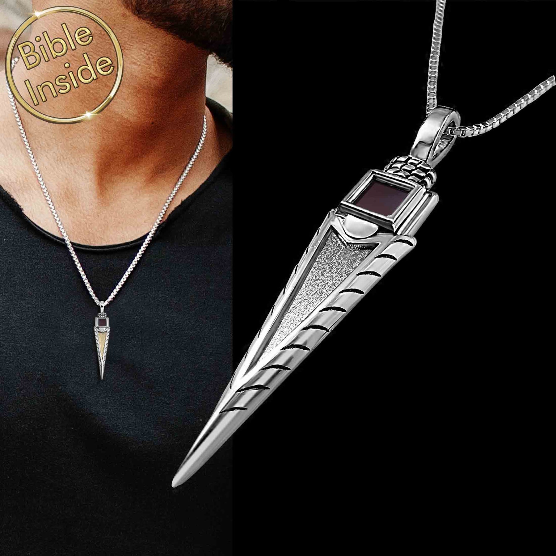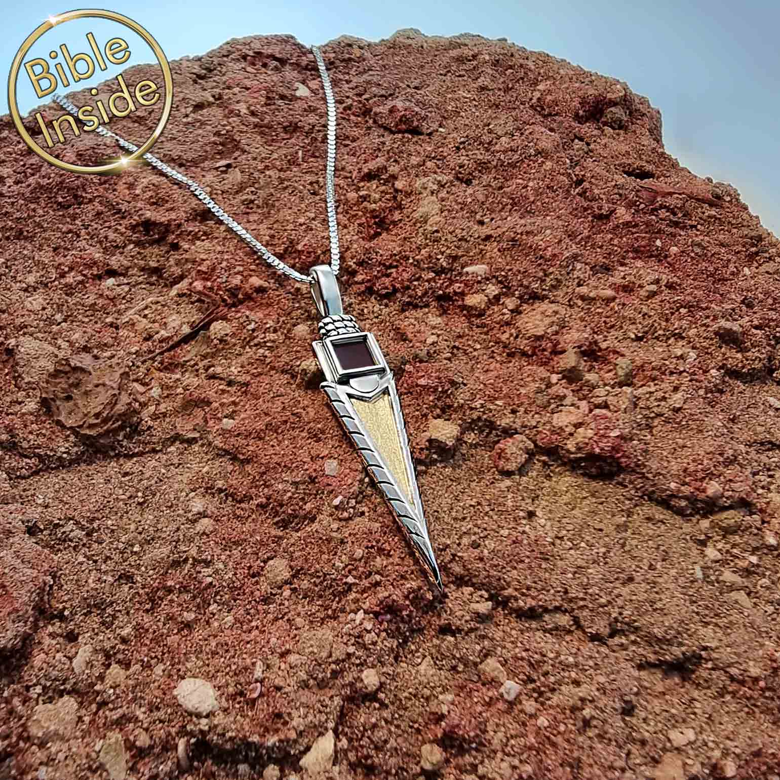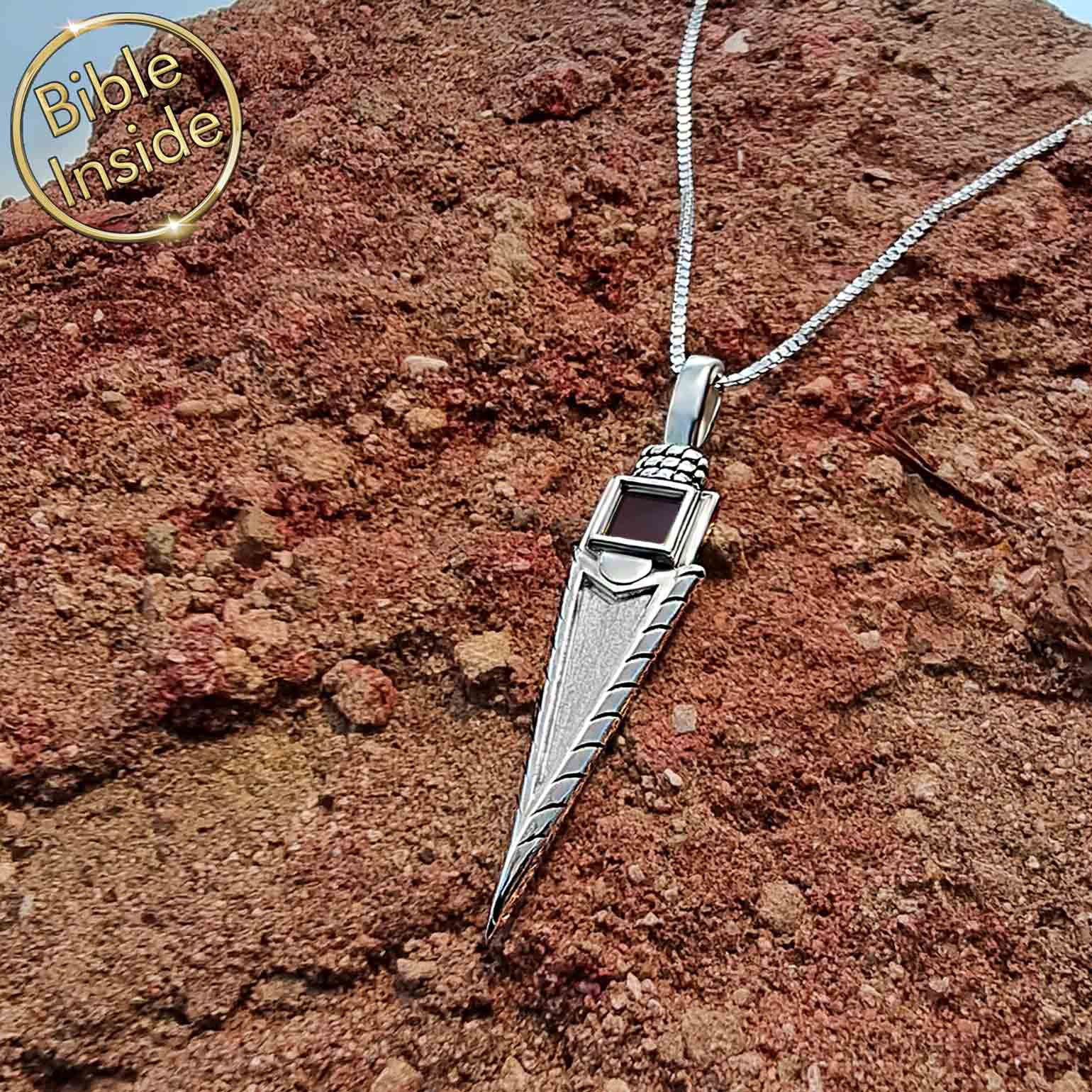 תליון החץ משמש תזכורת נוקבת לקשר הבלתי ניתן לניתוק בין המסע שלכם לבין החוכמה החבויה בתנ"ך. השרשרת טומנת בחובה סוד, המילים העמוקות של התנ"ך חרוטות על ריבוע זעיר שכל גודלו 0.5 ס"מ. ניתן לראות אותו רק דרך מיקרוסקופ מיוחד, והוא מגלם את הטבע הדיסקרטי אך רב ההשפעה של הרוחניות שלכם.