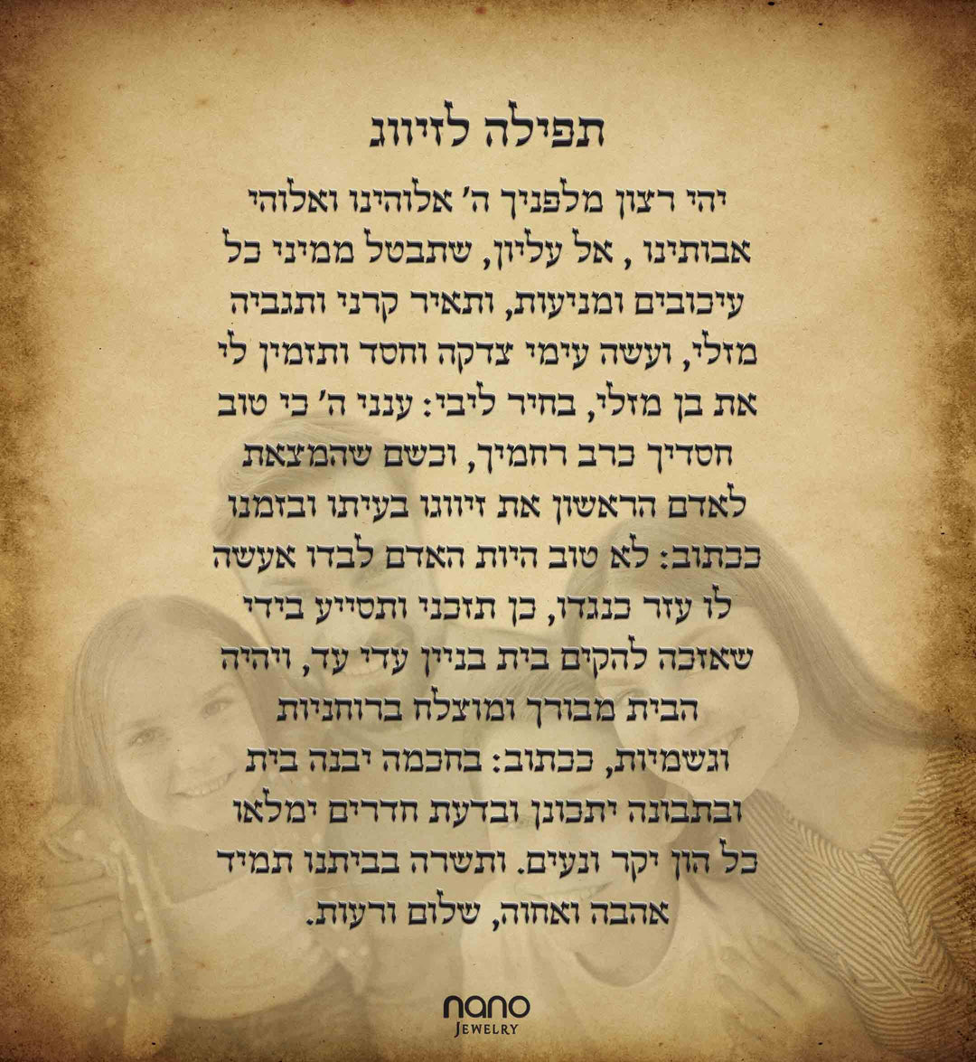 "יהי רצון מלפניך ה' אלוהינו ואלוהי אבותינו, אל עליון, שתבטל ממיני כל עיכובים ומניעות, ותאיר קרני ותגביה מזלי, ועשה עימי צדקה וחסד ותזמין לי את בן מזלי, בחיר ליבי: ענני ה' כי טוב חסדיך כרב רחמיך, וכשם שהמצאת לאדם הראשון את זיווגו בעיתו ובזמנו ככתוב: לא טוב היות האדם לבדו אעשה לו עזר כנגדו, כן תזכני ותסייע בידי שאזכה להקים בית בניין עדי עד, ויהיה הבית מבורך ומוצלח ברוחניות וגשמיות, ככתוב: בחכמה יבנה בית ובתבונה יתכונן ובדעת חדרים ימלאו כל הון יקר ונעים. ותשרה בביתנו תמיד אהבה ואחוה, שלום ורעות".