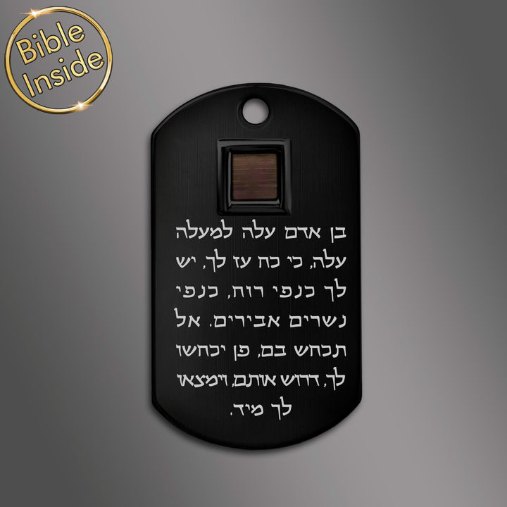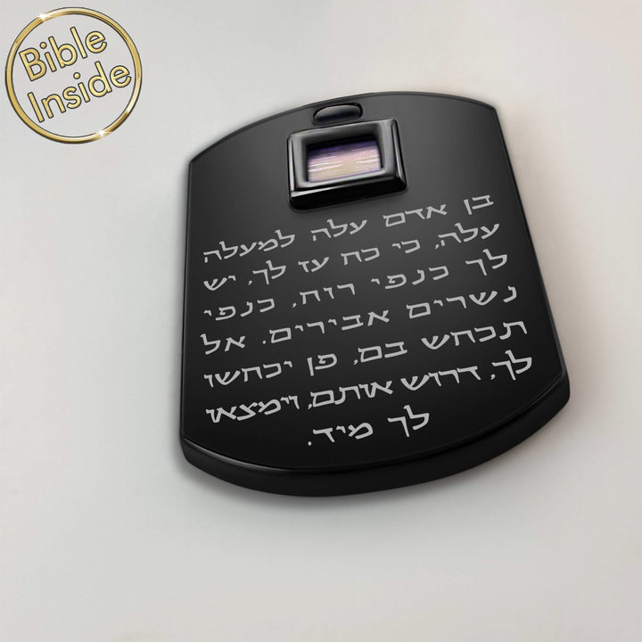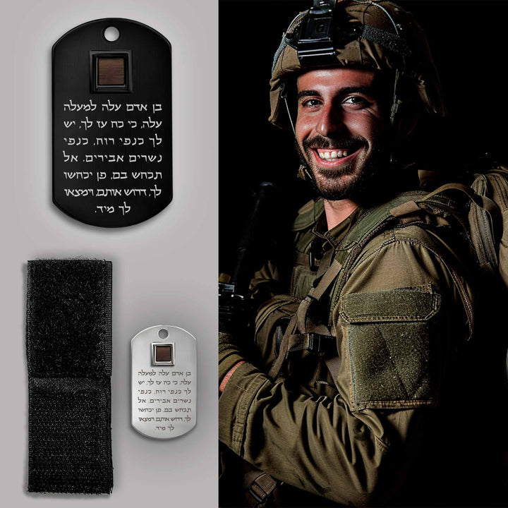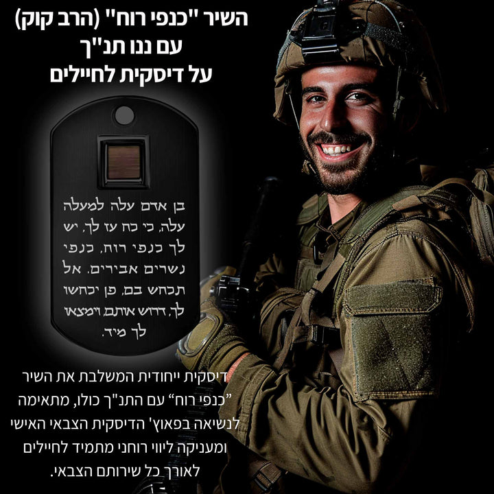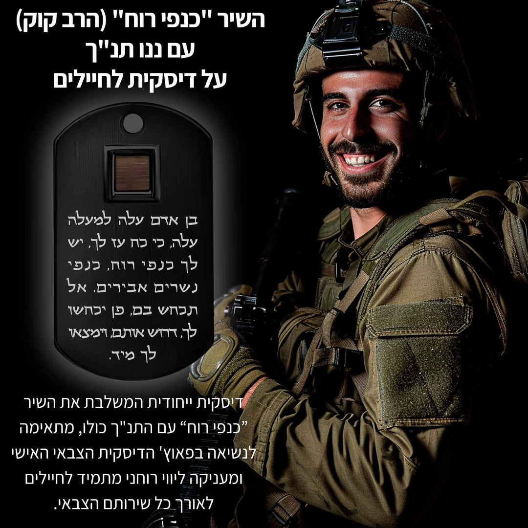 הדיסקית המיוחדת לחיילים הזו מעניקה חוויה רוחנית ורגשית עוצמתית. היא משלבת את התנ"ך כולו על שבב ננו קטן יחד עם שירת "כנפי רוח" המרגשת של הרב קוק. בכל רגע מאתגר בשירות, החייל שלכם ירגיש את הקשר העמוק אתכם, גם כשאתם רחוקים. הדיסקית נישאת בנרתיק הדיסקיות הצבאי לצד דיסקית הזיהוי הרשמית, יוצרת נוכחות מתמדת של תמיכה ואמונה.