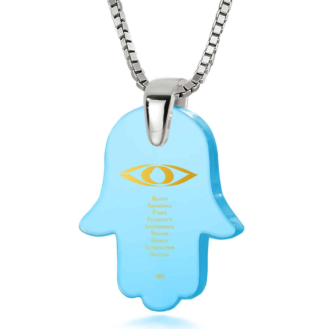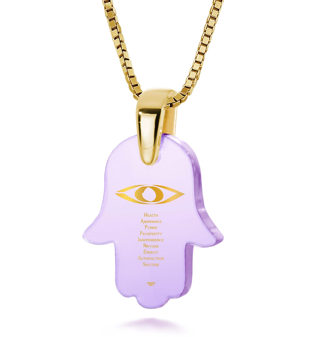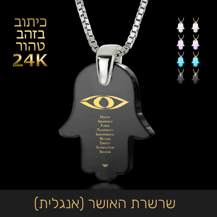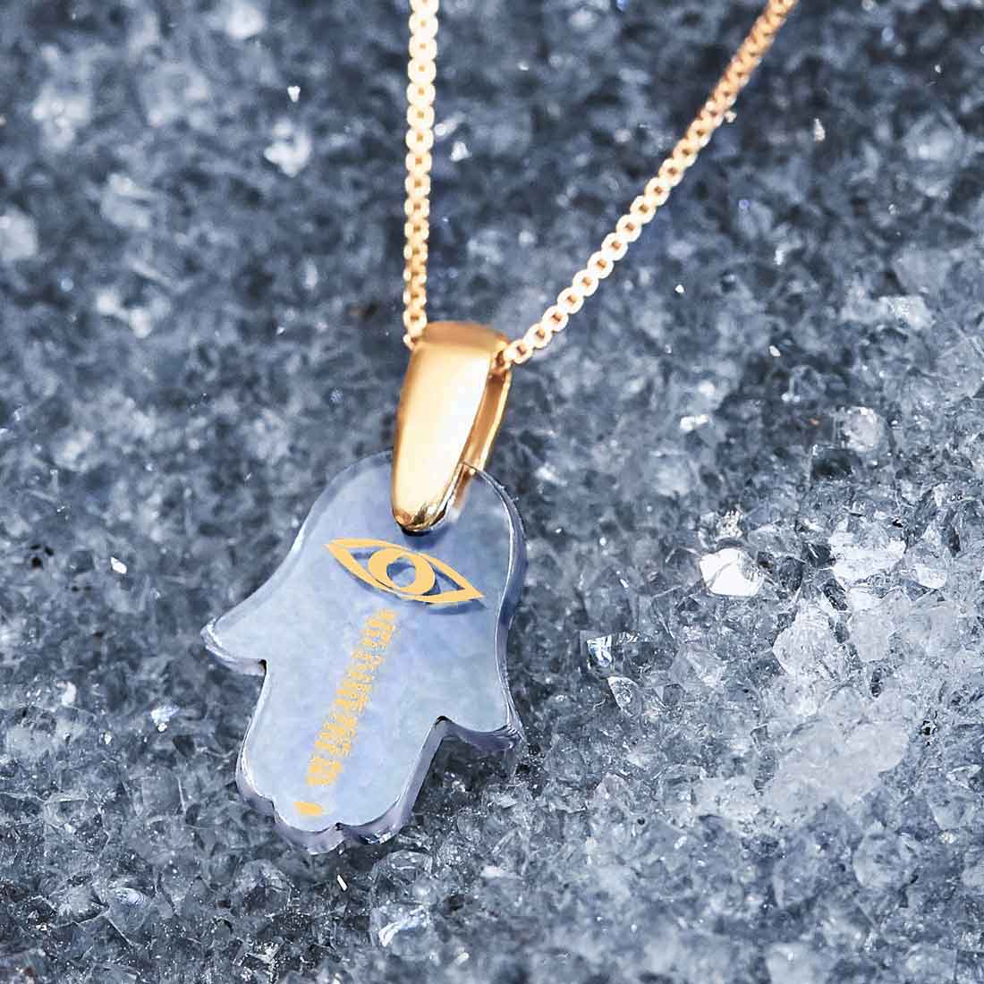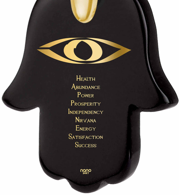 תליון חמסה המשלב אבן זירקוניה ברמה הגבוהה ביותר עם כיתוב בזהב טהור של איחולים שחיבור האותיות הרישיות שלהם יוצר את המילה Happiness.