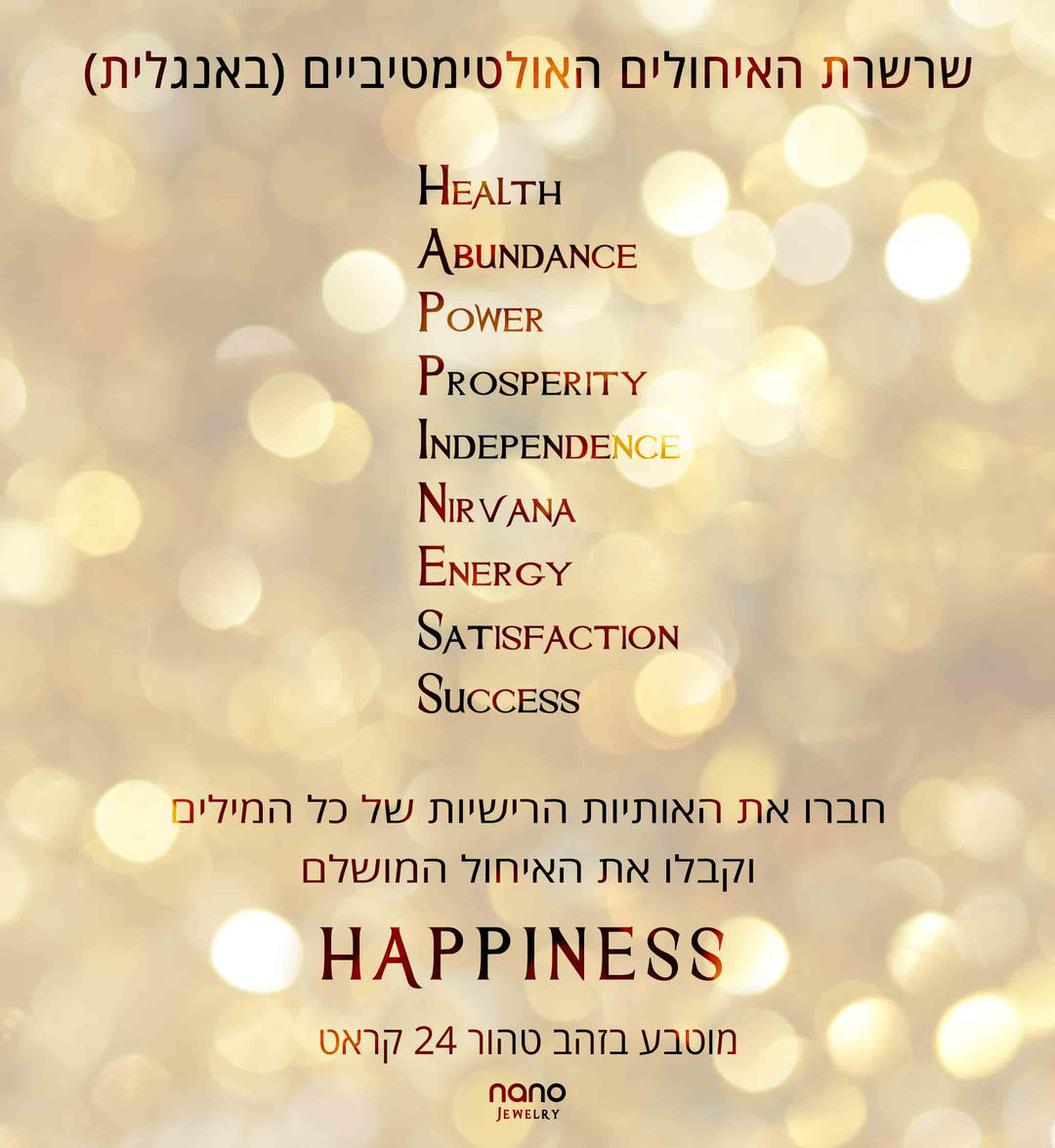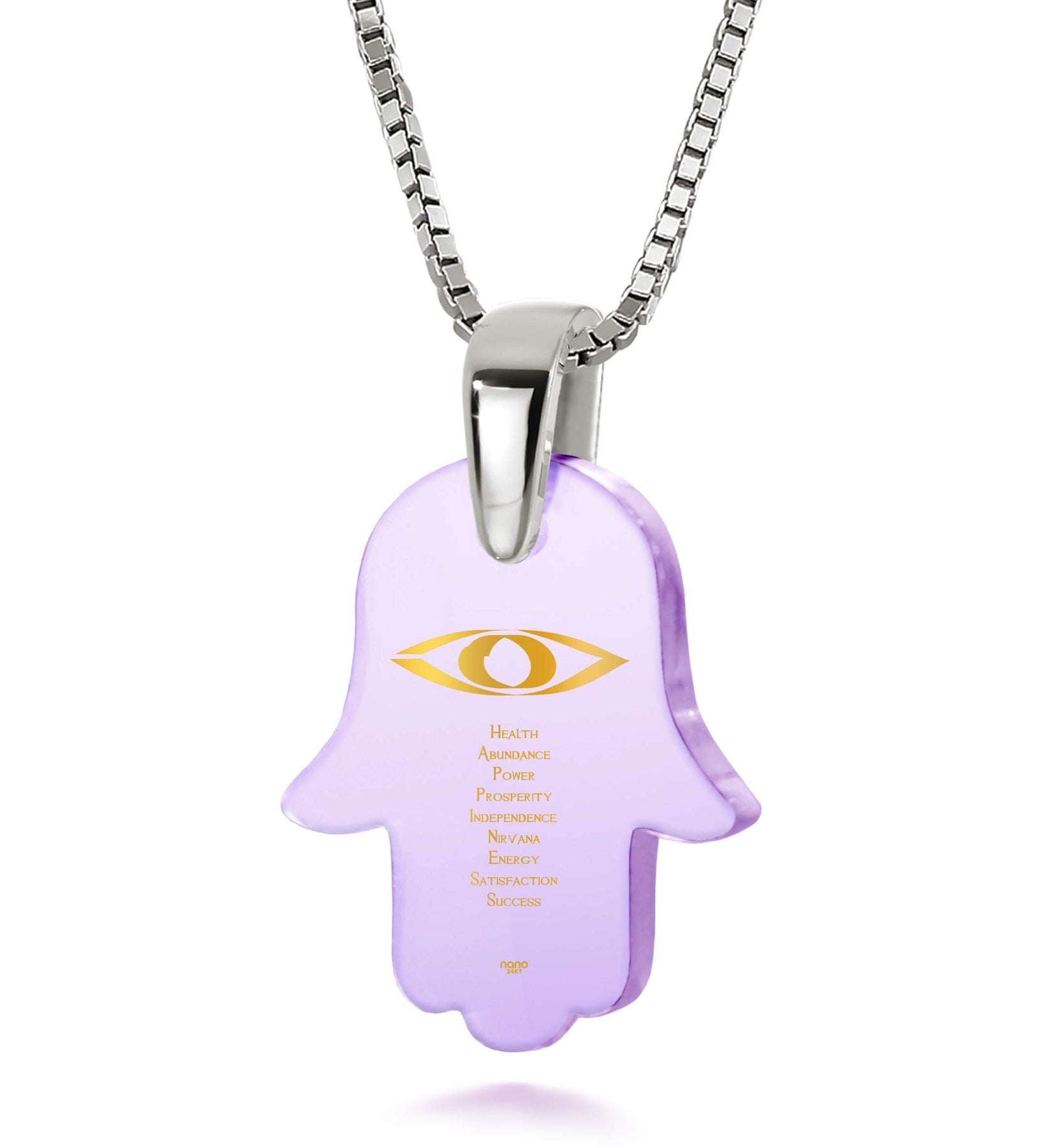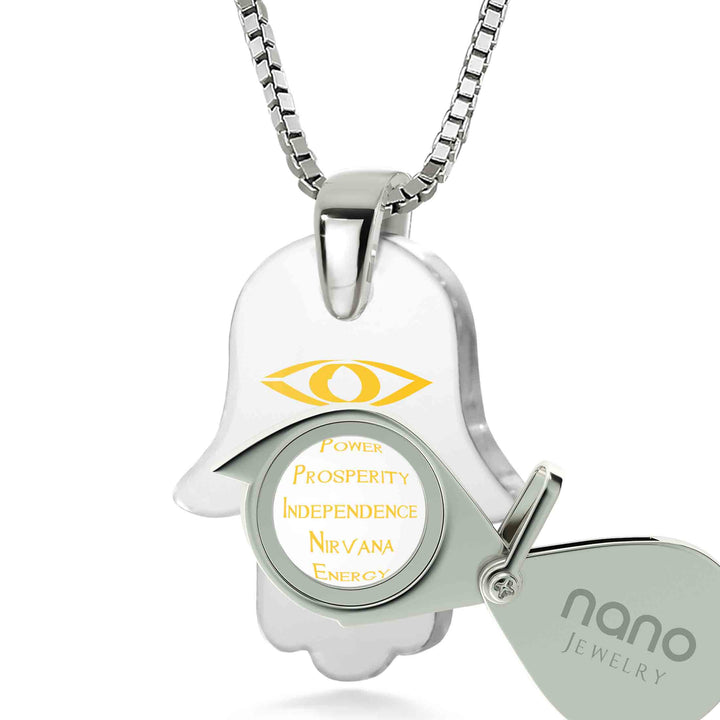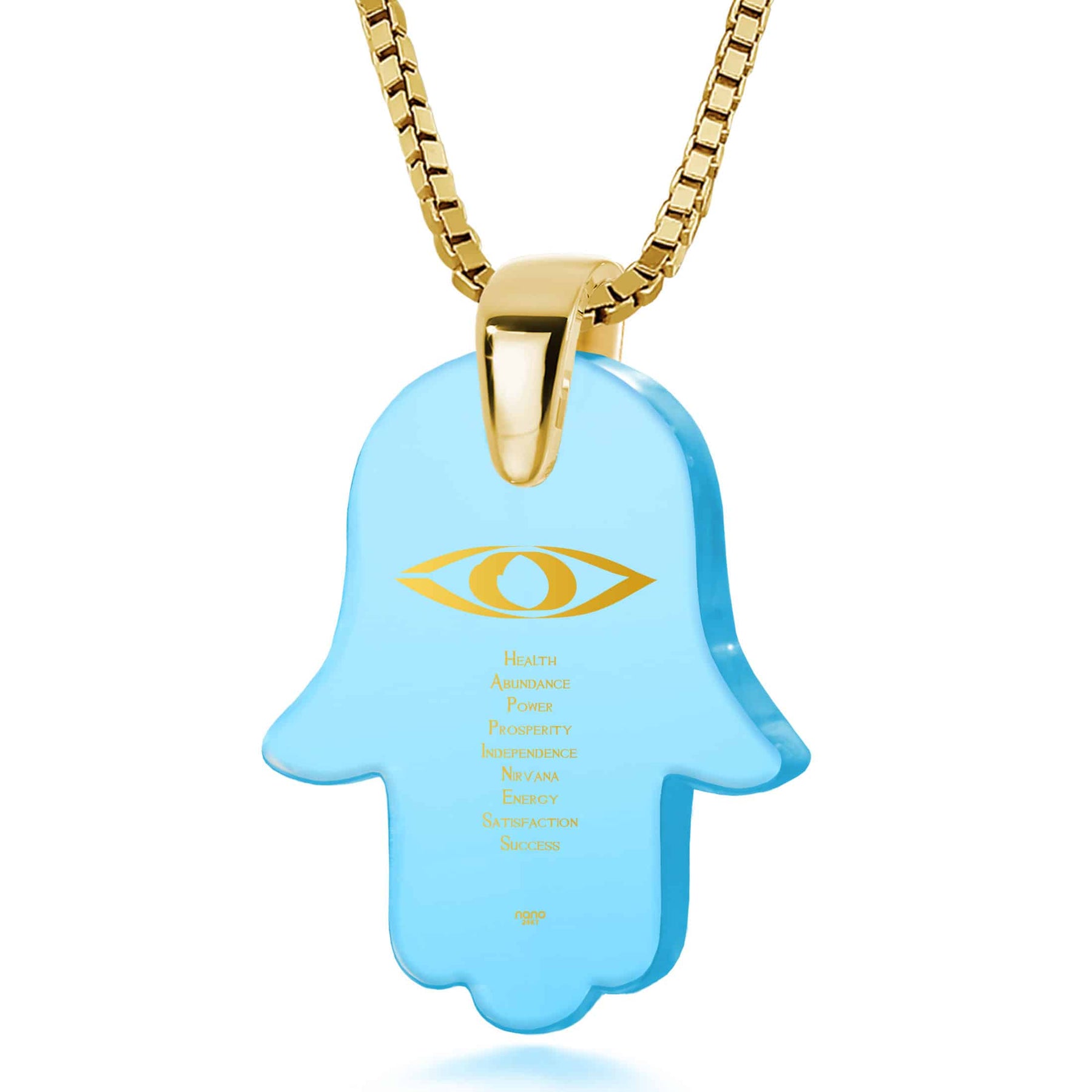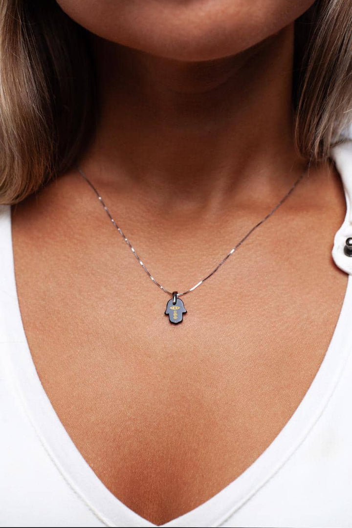 תליון חמסה המשלב אבן זירקוניה ברמה הגבוהה ביותר עם כיתוב בזהב טהור של איחולים שחיבור האותיות הרישיות שלהם יוצר את המילה Happiness.