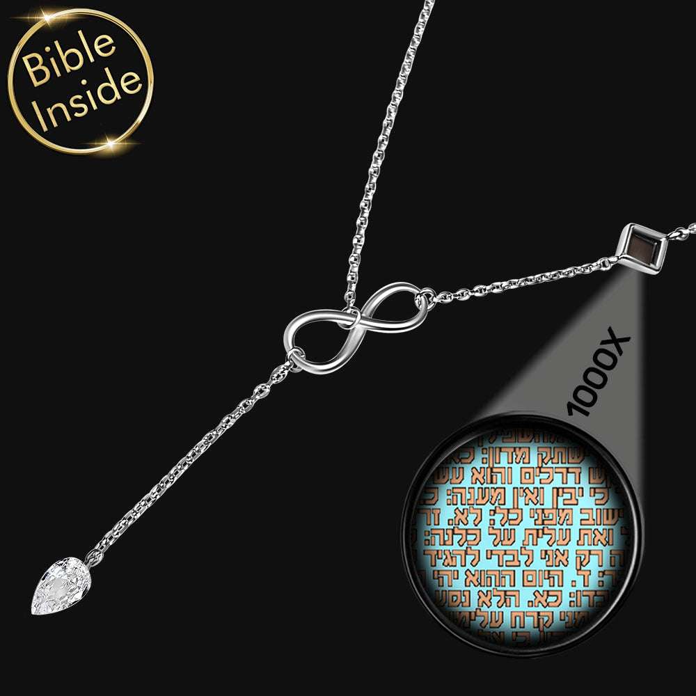 תכשיט תנך שמשלב בין אופנה, חדשנות ומשמעות. שרשרת האינסוף הזו מעוצבת עבור האישה המודרנית המחפשת גם סגנון וגם מהות, כולל את שבב הננו תנך יוצא הדופן. הריבוע הזעיר הזה בגודל 0.5 ס"מ מכיל את כל הטקסטים הקדושים של התנך, מוסתרים באומנות עד שהם נחשפים במיקרוסקופ מיוחד. חווי מיזוג שובה לב של אופנה ואמונה עם שרשרת האינסוף שלנו. שבב הננו תנך, החבוי בתוך התכשיט המעודן הזה, מסמל את החיבור הבלתי נגמר למורשת ולאמונות שלך. תכשיט זה משקף את המהות הרוחנית העמוקה שלך.